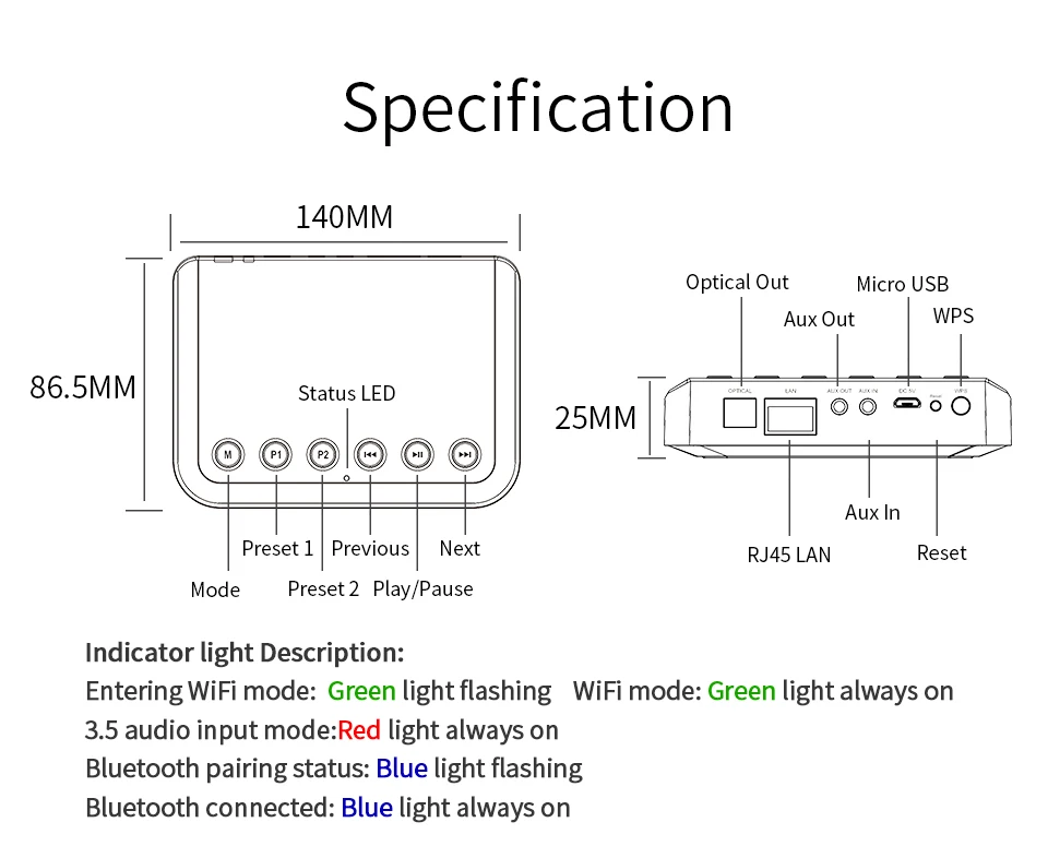 4. Mode switching: you can switch between WIFI/Bluetooth/audio input by pressing the button M or APP, you can switch WIFI in the APP, and play on the music software in the APP will automatically switch to WIFI, and you can also use the protocol on the mobile music software Push to return to WIFI mode. Switching from Bluetooth mode to WIFI requires protocol push in another music software and cannot be switched by the same music software.